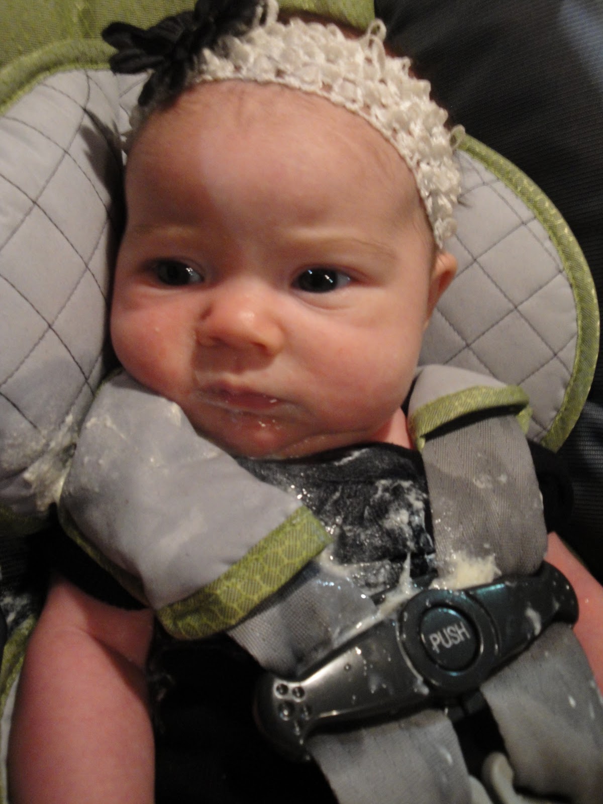 This is the mess we had to clean up after leaving the movie theatre from seeing "Life as we Know it". I put her in her carseat, and look what she did. Taking a car seat completely apart to wash it is NOT fun. Reassembling the carseat is even worse.